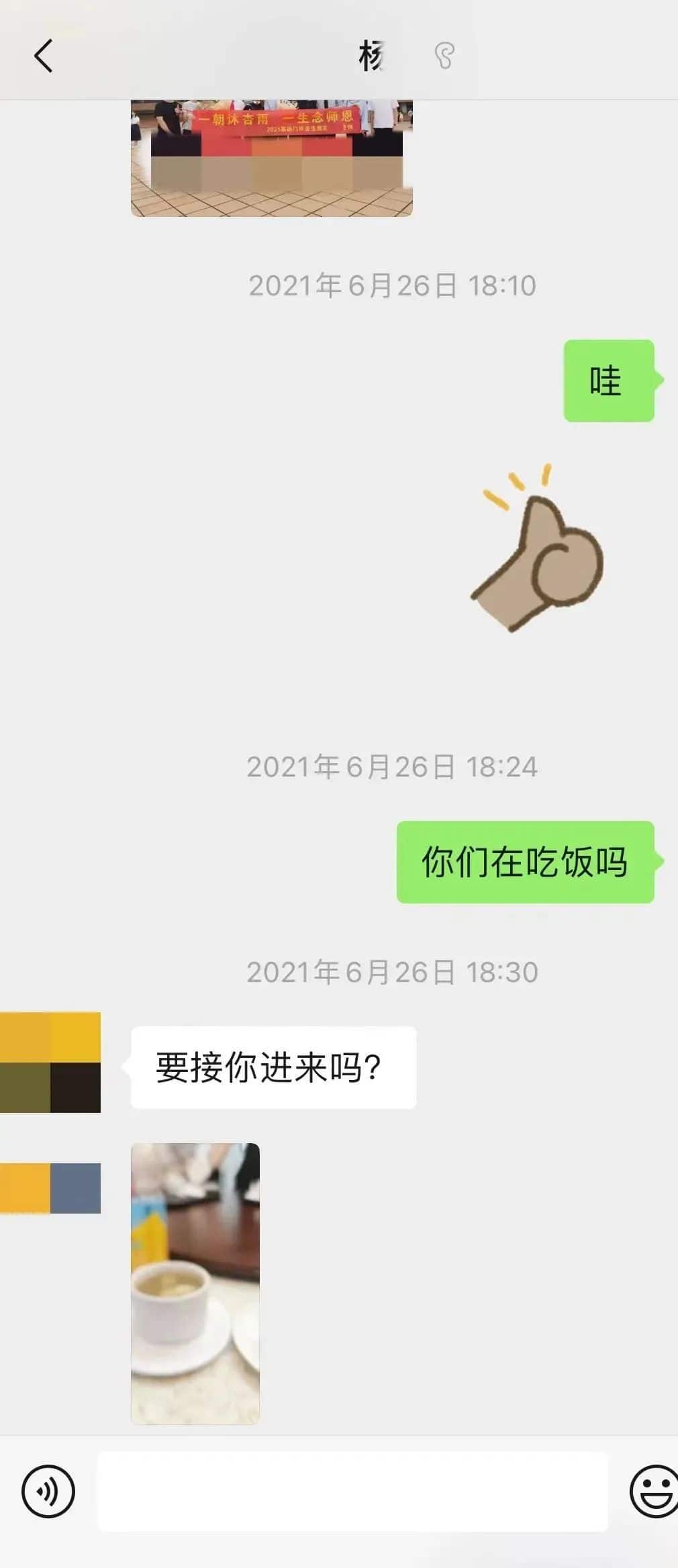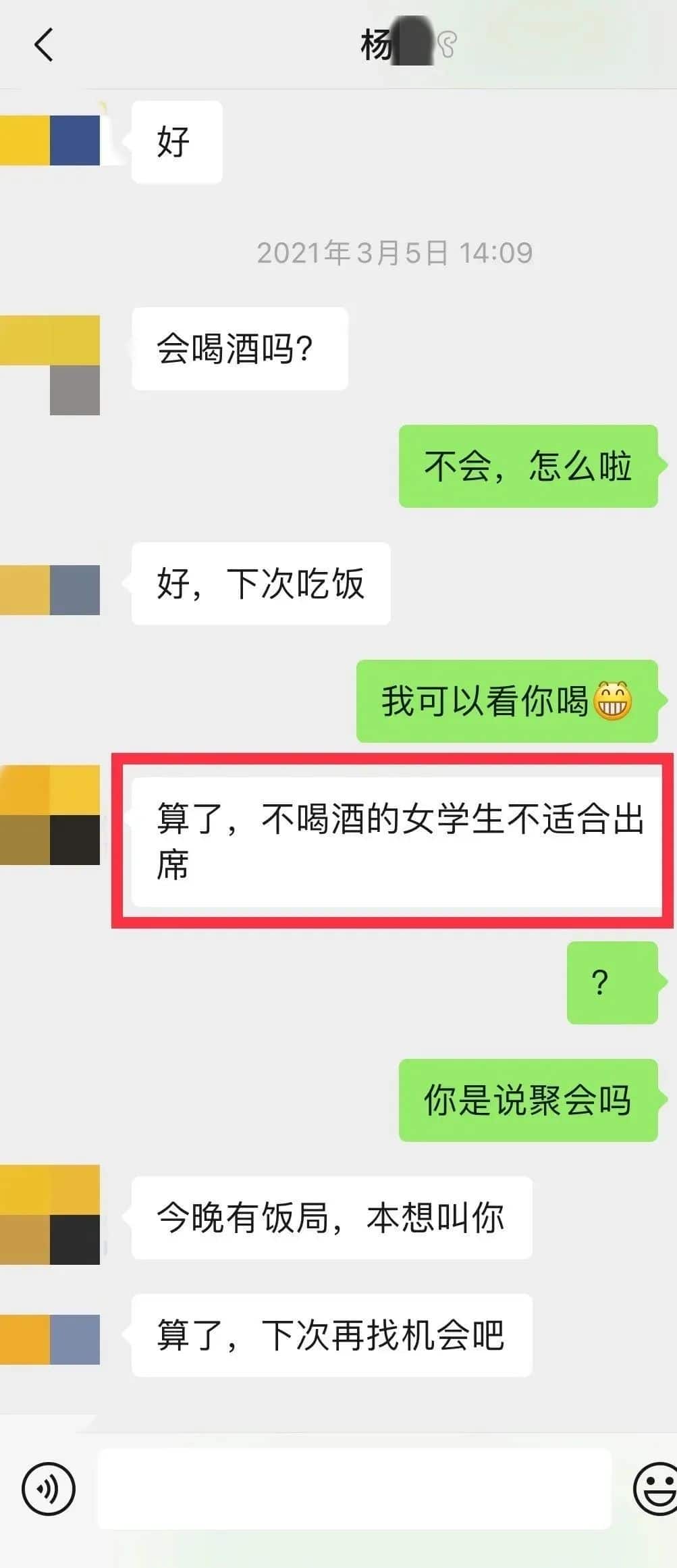 有天我收到他发的微信:“会喝酒吗?”我回答:“不会,怎么了?”他说:“不喝酒的女学生不适合出席。下次吃饭。”我当时觉得有点奇怪,但以为他在开玩笑就没说什么。