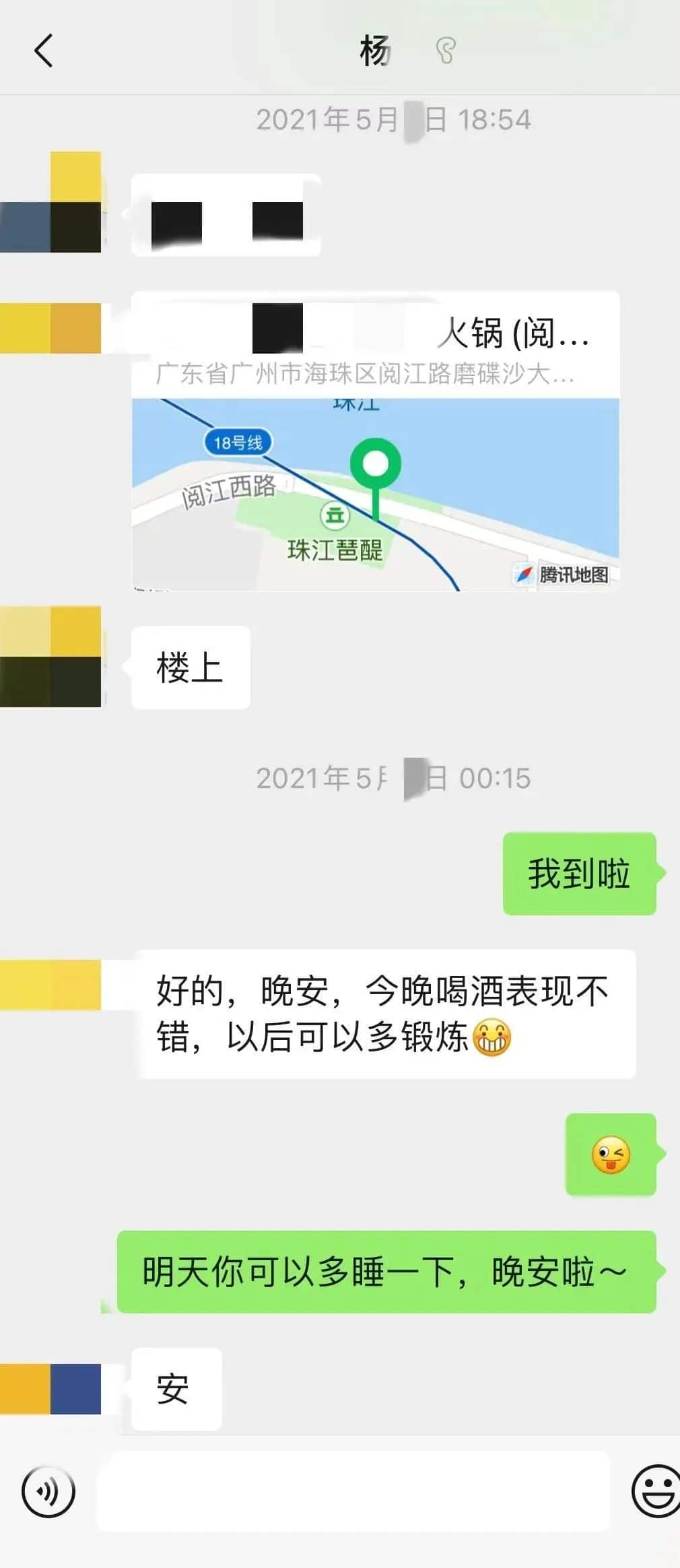 过了一些天,杨教授在琶醍陪我过生日,那天他带了红酒,说可以练习喝一点酒。吃完饭他跟我说以后他喝完酒要我记得给他点粥喝。我们吃完后他又带我去了江边天台切蛋糕,邻桌有一个三四岁的小女孩在旁边玩,他突然看着我说:“你给我生个女儿吧,我真的好想有一个女儿。”听到这话,我当时觉得,他是认真想和我有未来的。当晚他叫车送我回学校门口,我们坐在车后排座位,他在车上搂着我肩膀,并将手放在我腿上一路回来,我虽然紧张,但心中在安慰自己谈恋爱有这些行为大概是正常的。回去后收到短信,他说:“今天晚上喝酒表现不错,以后可以多锻炼”。