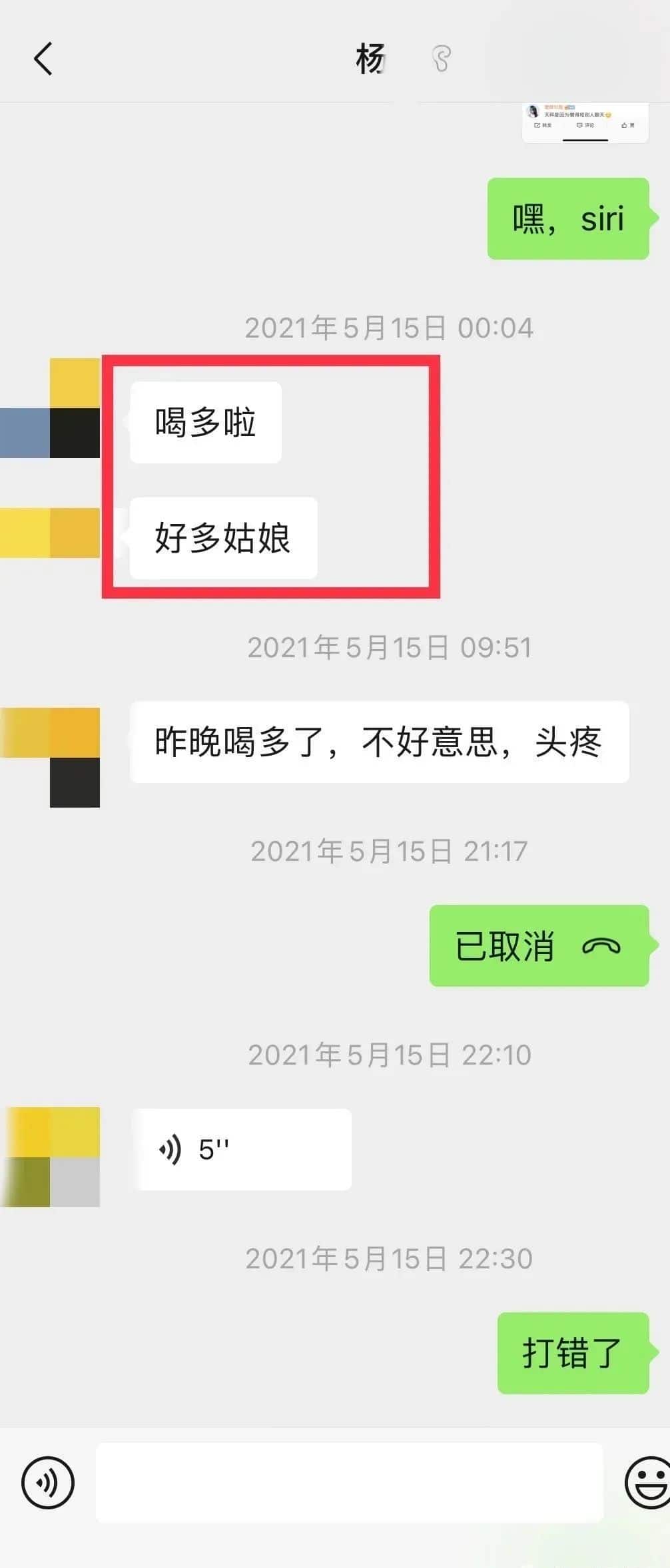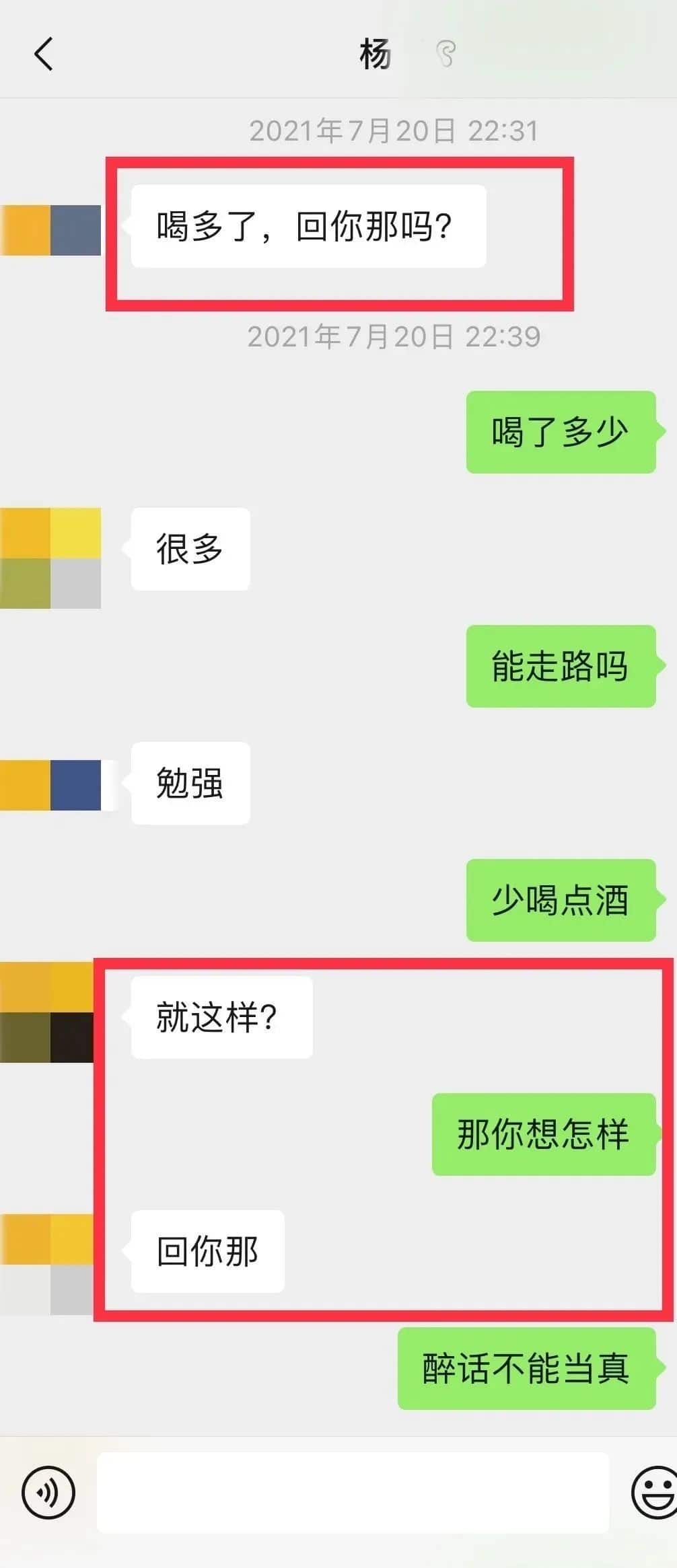 我发现他好像总是有很多酒局,那段时间有天他说在上海出差,凌晨他突然发消息说:“喝多了,好多姑娘”。醒后又告诉我昨晚喝多了不好意思,见面后我问他怎么回事,他说:“撩你,不受撩啊”,又强调只是有男有女的正常社交。