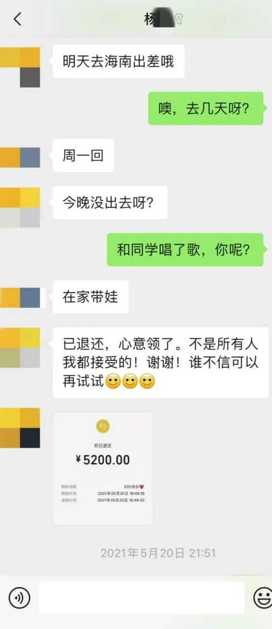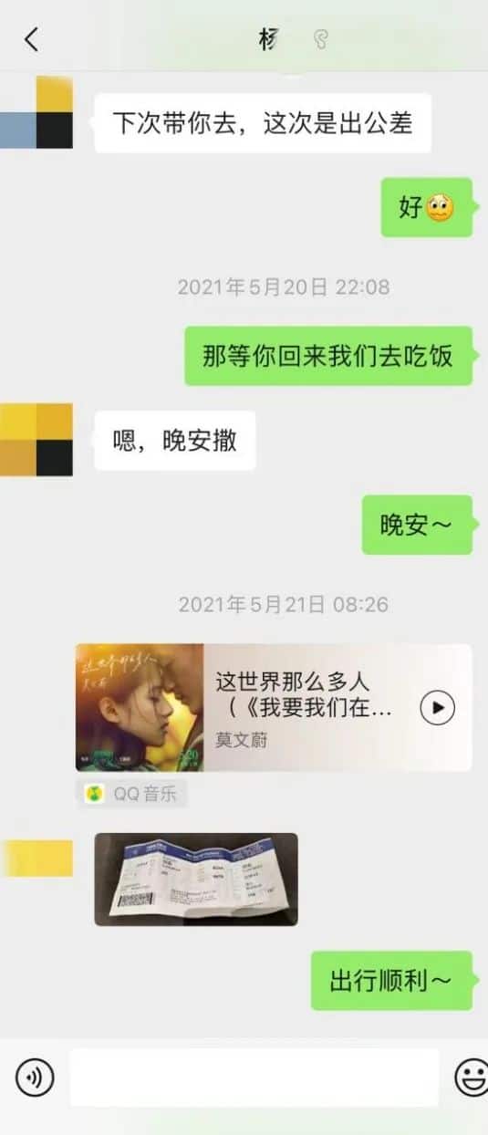 520 那天,他说第二天要去海南出差,还分享了机票给我,说是出公差。那段时间我们总聊天分享日常,他夸我有好媳妇的潜质,我们也会给对方的每一条动态点赞,但他总是行踪神秘,我还是觉得不对劲,觉得他会不会隐隐约约向我隐瞒了什么,就想再次向他确认对我们关系的真实想法,于是我们又约见面。