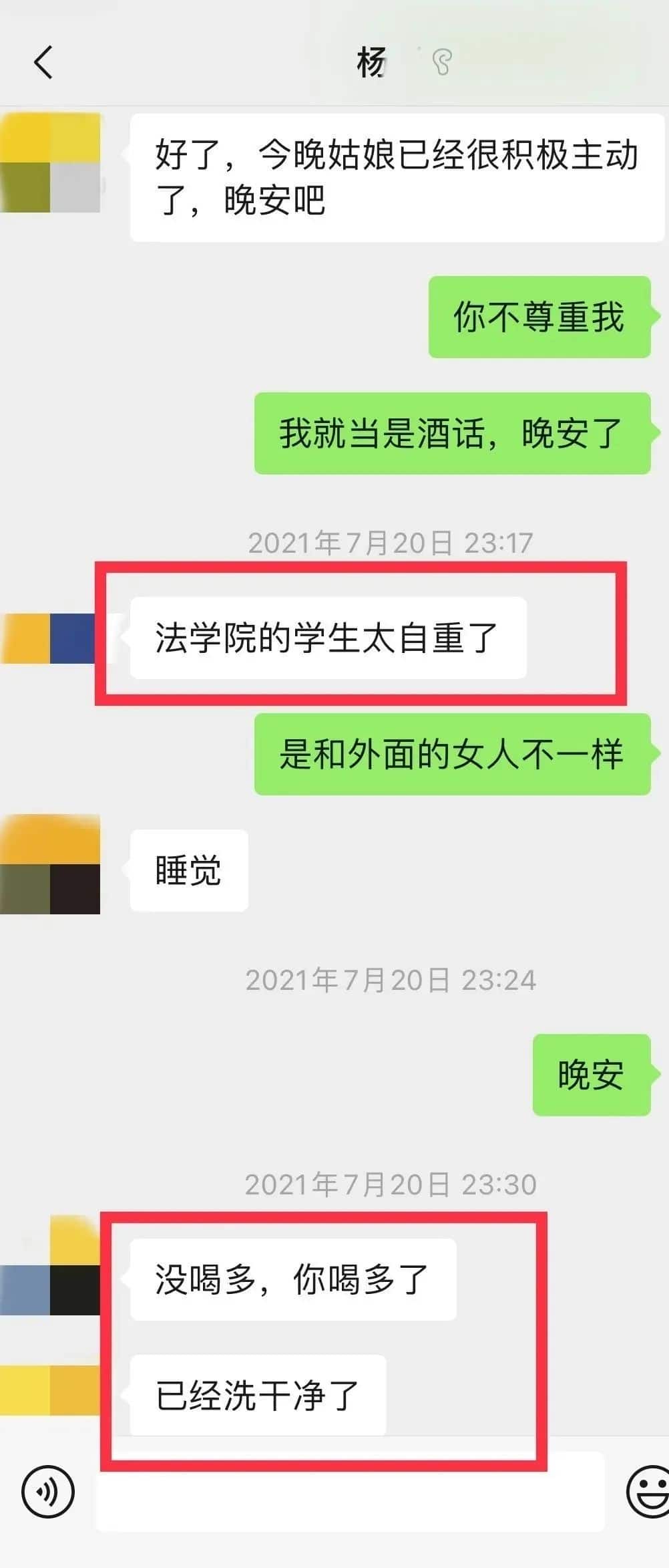 后来,我再次确认他是否单身,他的回答依然“是”。我问他想一直单身下去吗,他说以后他想找个学生。接着我问他是否知道我对他有好感,他说:“我一个中年男人,怎么可能不知道?”甚至跟我直截了当的说:“我没有不喜欢你,只不过我们认识的场合不对,如果我们是在饭局里认识,我今晚就带你去开房。”我立刻答道:“那我不会跟你去”。我的认真回复让他也愣了一下,随后他声称自己是年少得志,是法学院最年轻的教授,所以说话比较狂傲。我心里虽然觉得他说话的方式让我不适,但他说过他多疑,是不是在试探我是个随便的人,又基于他平时在课堂上的说话风格我又想他可能是在开玩笑。他又说:“不过如果我们不是在学校里认识,你还不一定看得上我”。杨教授知道他老师的身份是有光环的,如果不是基于一种崇拜和信任,我不会轻易产生好感。