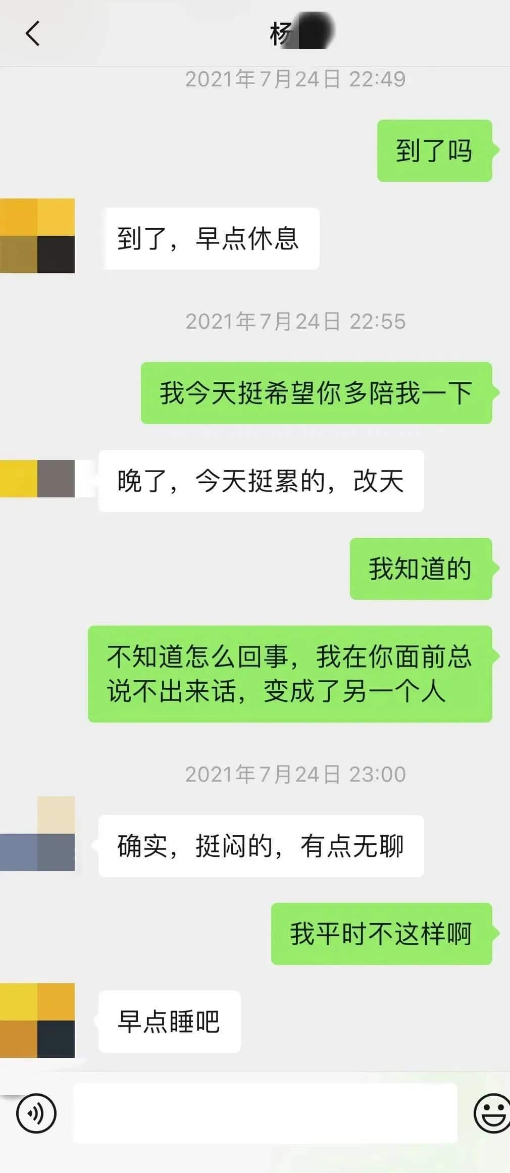 我们出去吃饭的时候他说我总是追问过去,说我太正经了不会谈恋爱。杨教授说恋爱的本质就是场博弈,不能看他说的,要看他怎么做。有时候他说我对他的感情一年以后就会变的,于是我需要不断向他证明。我总觉得见面时和微信聊天时他是两种不同的态度。他说是在忙工作,我告诉自己要大度,也要搞好自己的工作。那段时间我不断地在理性与感性中挣扎,他总是说我多虑了。被他说久了我也开始自我怀疑,是不是我真的多想了,又或许是真的对他的崇拜以及老师身份有滤镜吧,以至于一次次地在自我抗争中失败了。他的恋爱是种似乎是种奖惩制,他的忽冷忽热和疏远让我觉得是我的问题,逐渐产生了歉疚的感觉,仿佛变成了另一个人。直至后来我才反应到他的所言所行是种PUA。