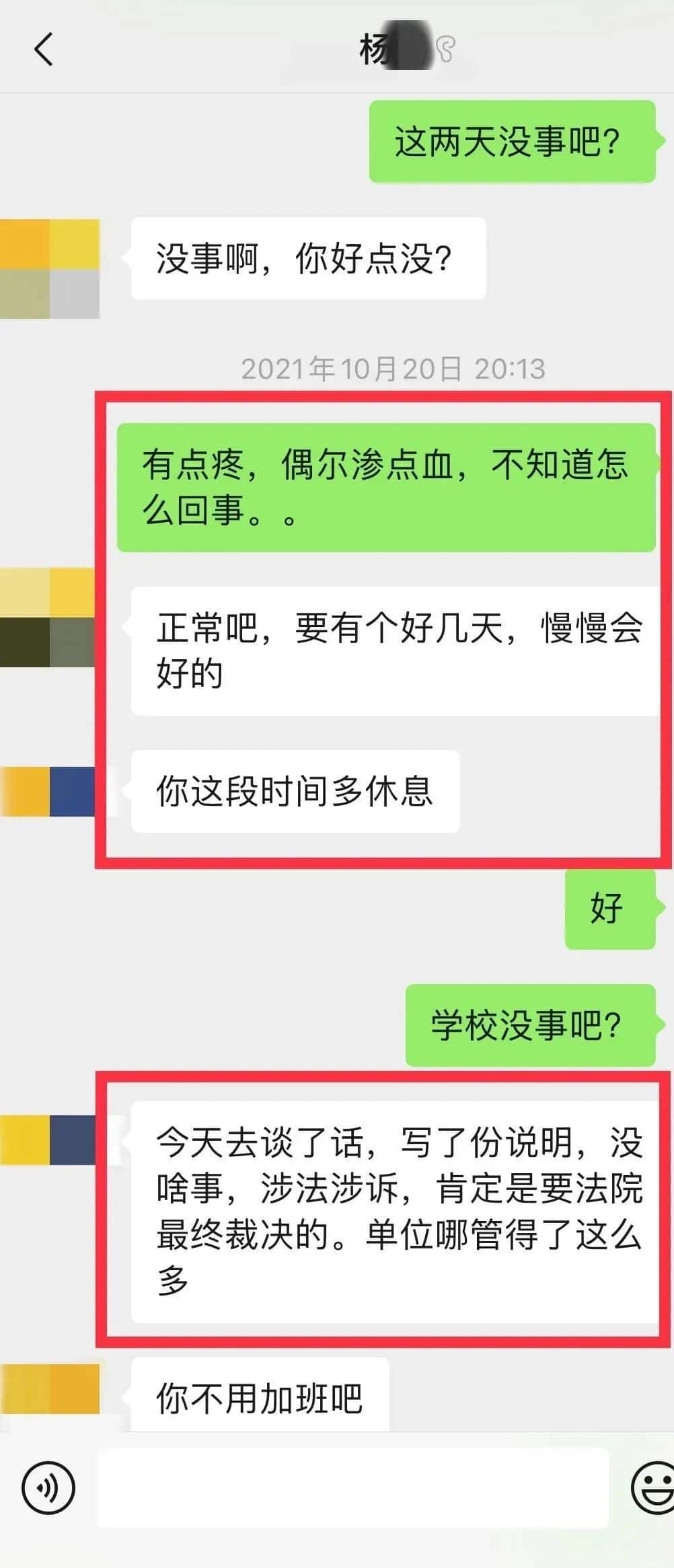 杨教授告诉我那两天学校有事要处理,有人给学校写了多封举报信,我怀疑是不是作风问题,他告诉我是经济纠纷,并声称他绝对没有任何问题且已胜诉,我也没敢打扰他,只是发消息问怎么样,他问我这两天没事吧,我回答这几天都在渗血,不知道怎么回事。他说正常吧,过几天就好了。我又问他学校没事吧,他说给学校写了检查,涉法涉诉学校哪管的了那么多。(后来我在裁判文书网搜索了关于他的生效判决,杨教授说谎成性,相关事件并非如他所言,具体可以上网查询)。