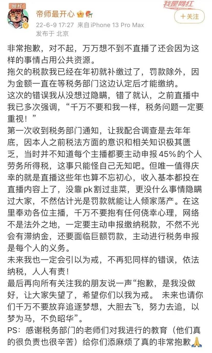 6月9日傍晚,“帝师”在个人微博(粉丝203.7万)发布致歉声明,透露拖欠的税款已经在年初补缴。帝师表示,第一次收到税务部门通知,让其配合调查是去年年底,因之前税法方面的意识和相关知识极其匮乏,当时并不知道每个主播都要主动申报45%的个人劳务所得税,“这事只能怪自己无知吧”
