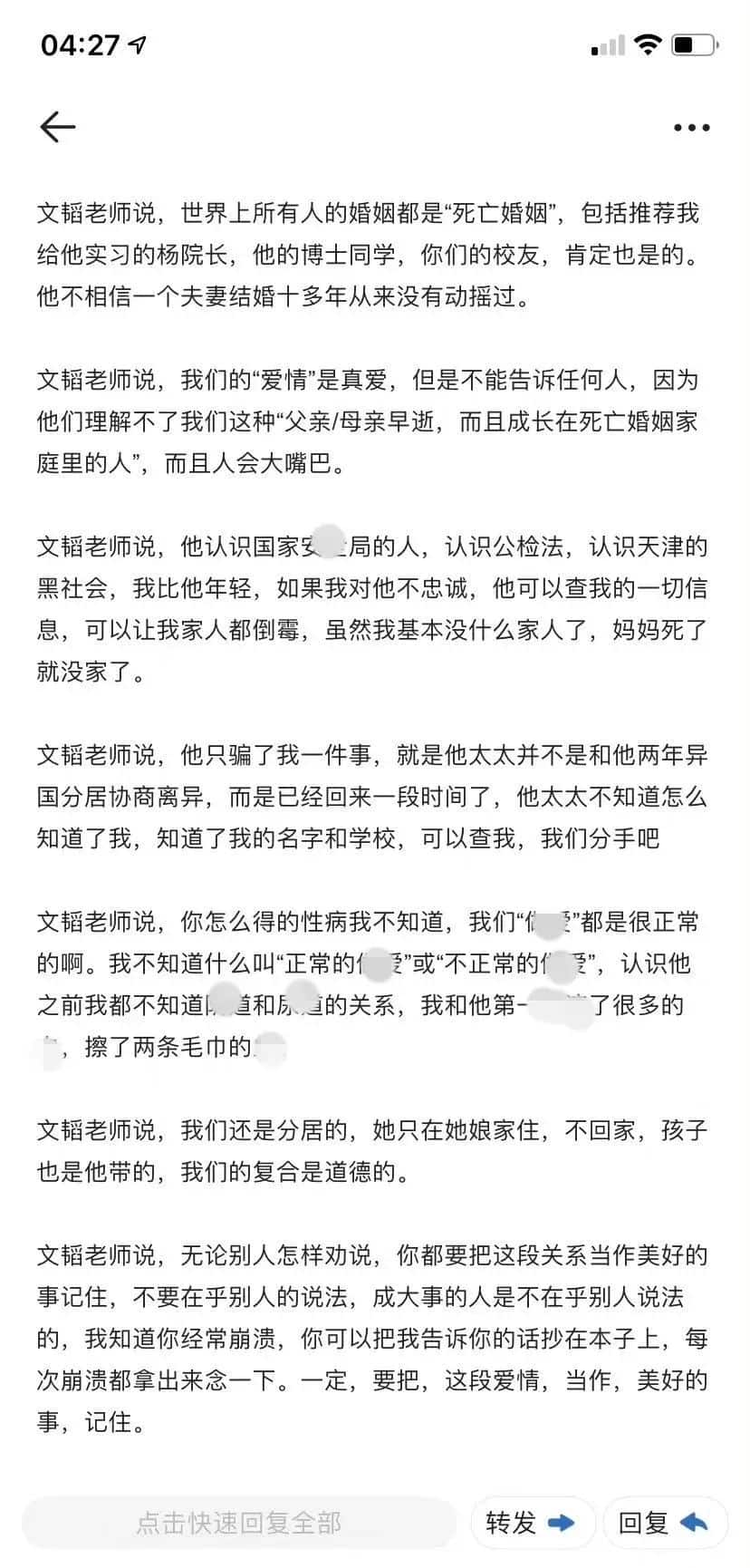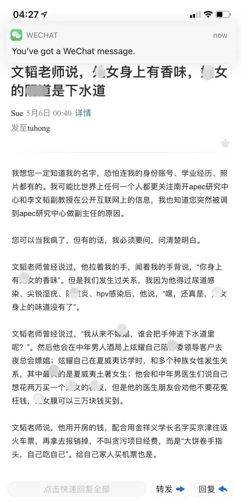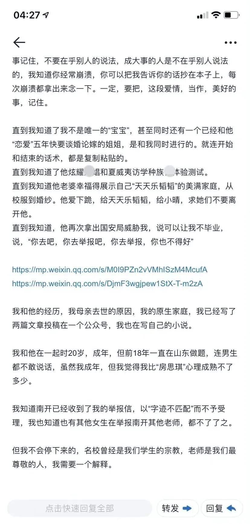 “C女身上有香味”,一女子举报南开大学教授有老婆还诱骗她,弄脏了她身子!