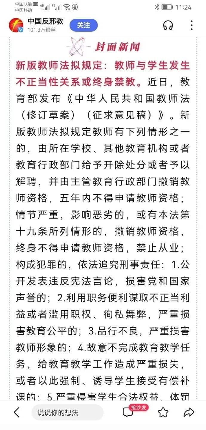 2021年12月1日起新版教师法拟规定:教师与学生发生不正当性关系或终身禁教