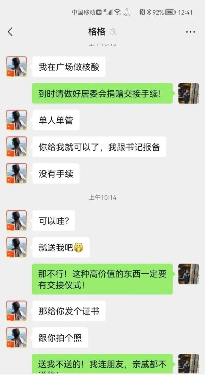 上海浦东新区三林镇三林三居的居委干部朱某凤女士,向小区内的爱心居民钟先生索要收藏的翡翠平安扣作为“抗疫物资”,并且要求捐赠给朱女士个人!(该爱心居民事前已向居委捐赠了口罩、防护服等抗疫物资)
