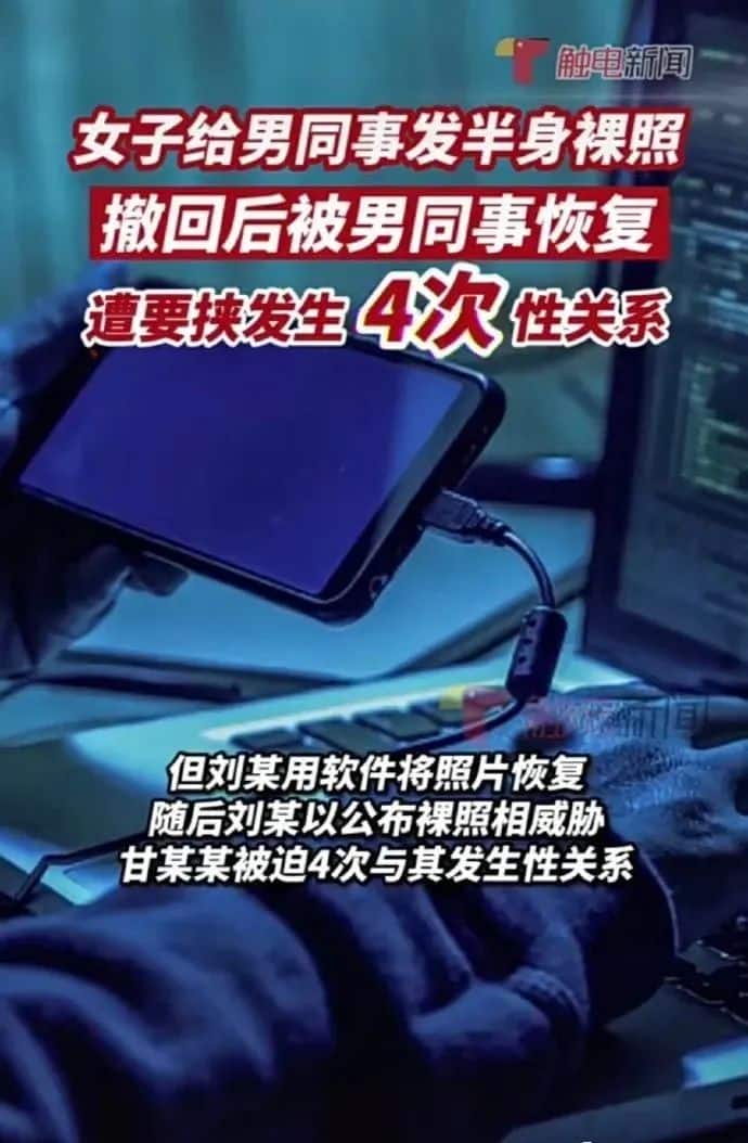 女子给男同事发裸照后撤回,不料被对方用软件恢复,被迫发生4次关系