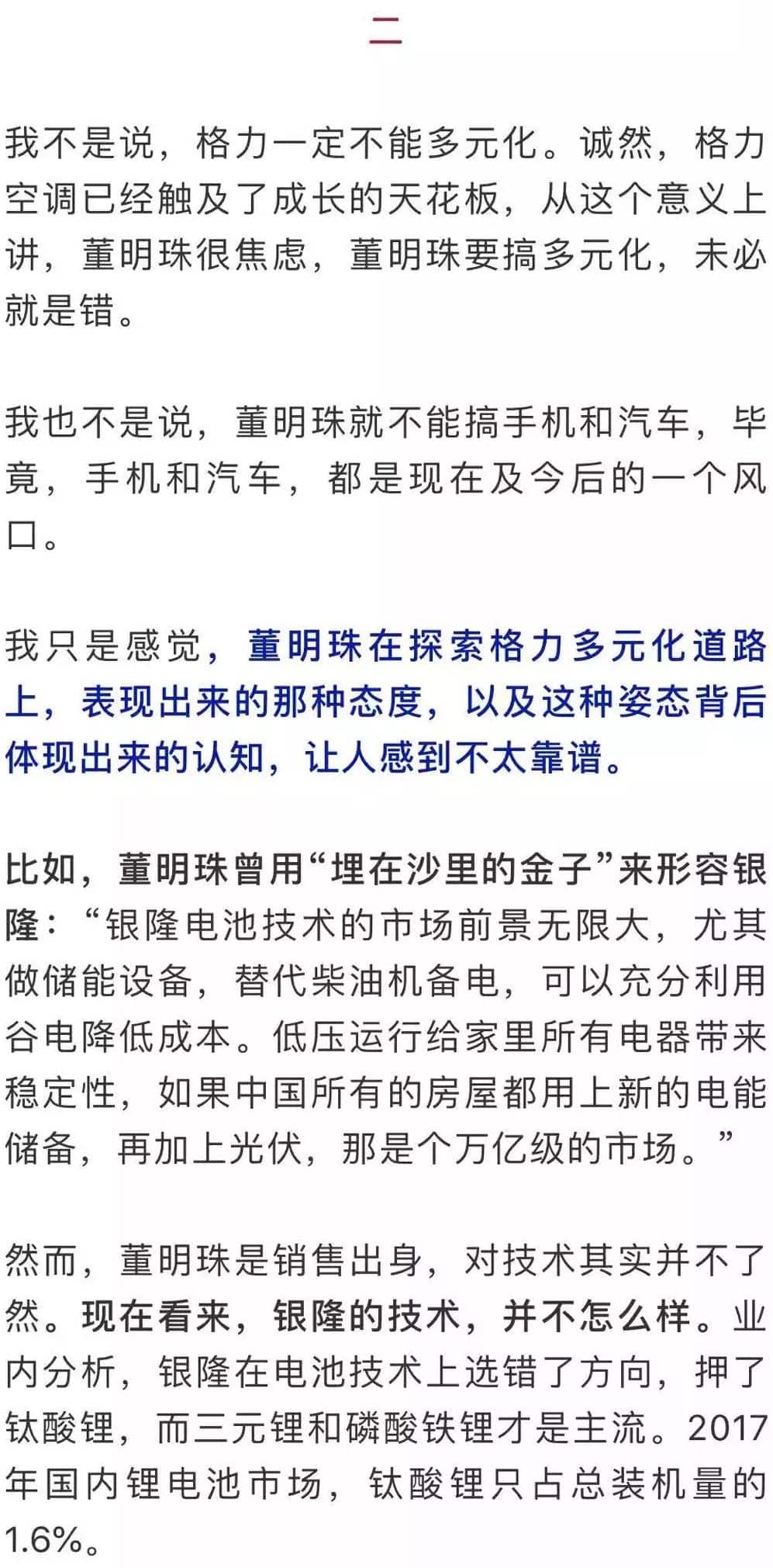 再比如,对银隆技术的分析,各种文章已经太多太多。但董明珠可能并没有好好去看,起码没有深入去研究,也没有预料新能源汽车道路的艰难。要知道,现在美国的特斯拉,技术那么牛逼,仍然陷入亏损无法盈利呢!