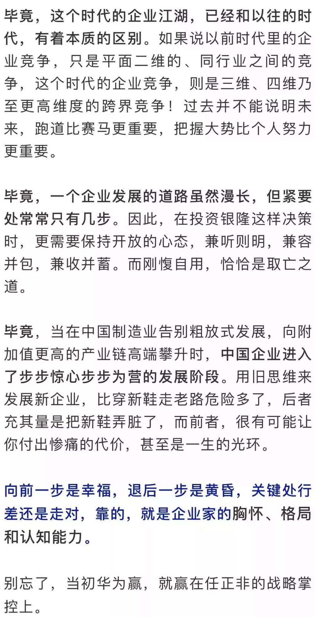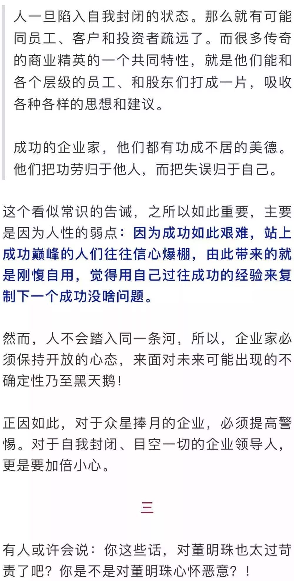 其实恰恰相反,如果连贯地读过我专栏的话,都知道,我对董大姐素来非常景仰。正因景仰,我对董大姐的期待更高,我不只是把她当作一般的管理者,更把她对标伟大企业家,希望她能进入历史。