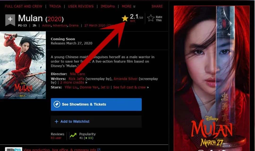 这还没完,接着这群跳梁小丑在IMDb上狂刷“一星好评”,《花木兰》先是被打出2.1分