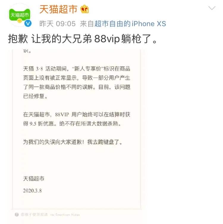 对此,天猫超市3月8日发布声明称,“绝不存在所谓大数据杀熟”。