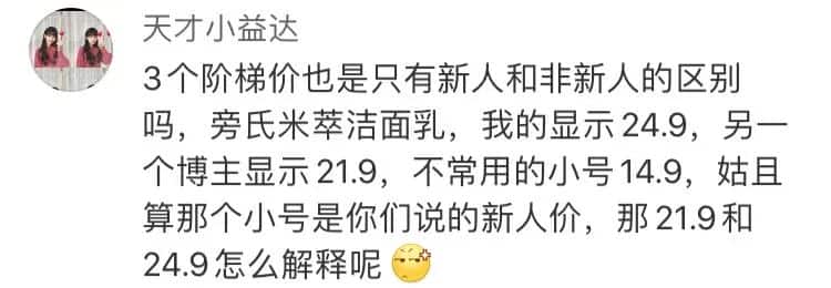 有人随后评论称,三个阶梯价也是只有新人和非新人的区别吗?姑且算小号价格属于‘新人价’,那21.9元和24.9元怎么解释呢?
