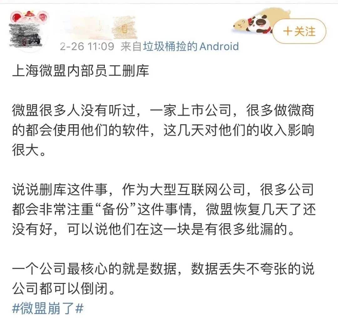 一个员工,独立操作,就能把一家上市公司的数据破坏到这种程度,甚至可以连备份一块搞掉,权限隔离怎么做的?无论他是一个什么角色,都意味着微盟在后端管理的极度混乱。