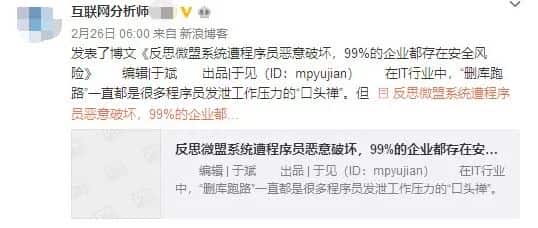 微盟公关也是拼,26日早上6点,一个名叫“互联网分析师于某”的人发了一个洗地公关稿,标题是“反思微盟系统遭程序员恶意破坏,99%的企业都存在安全风险”。