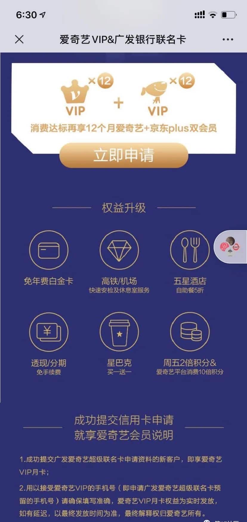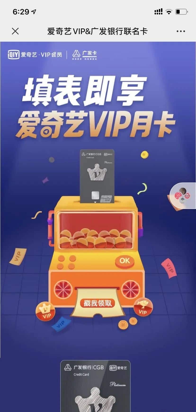 而他口中的无限撸爱奇艺会员,实际是近期广发银行为了刺激发卡量刺激业绩和爱奇艺VIP&广发银行联名卡做的一个活动。