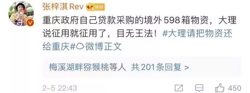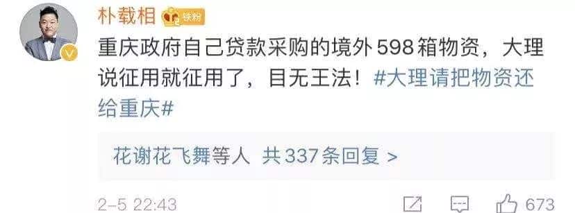 大理把重庆市政府和黄石市政府一起从缅甸购买的应急物资,一共9件598箱30万个口罩,在云南用顺丰发货时给扣下征用了。
